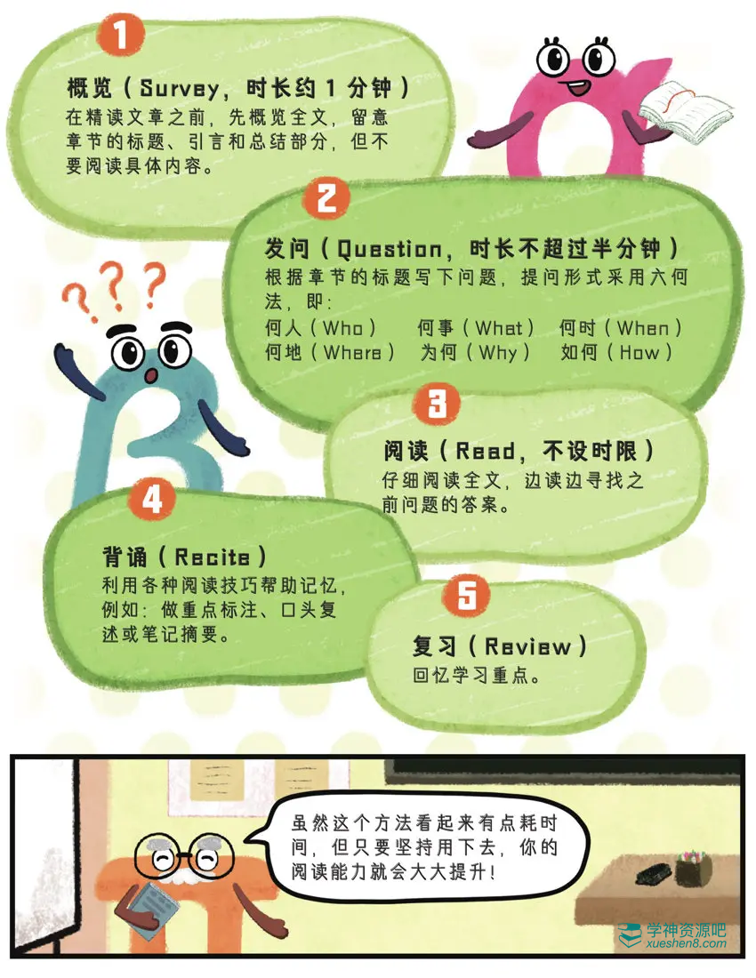 R:Recite(背诵:利用各种阅读技巧帮助记忆,比如:做重点标记、口头复述或写笔记摘要)