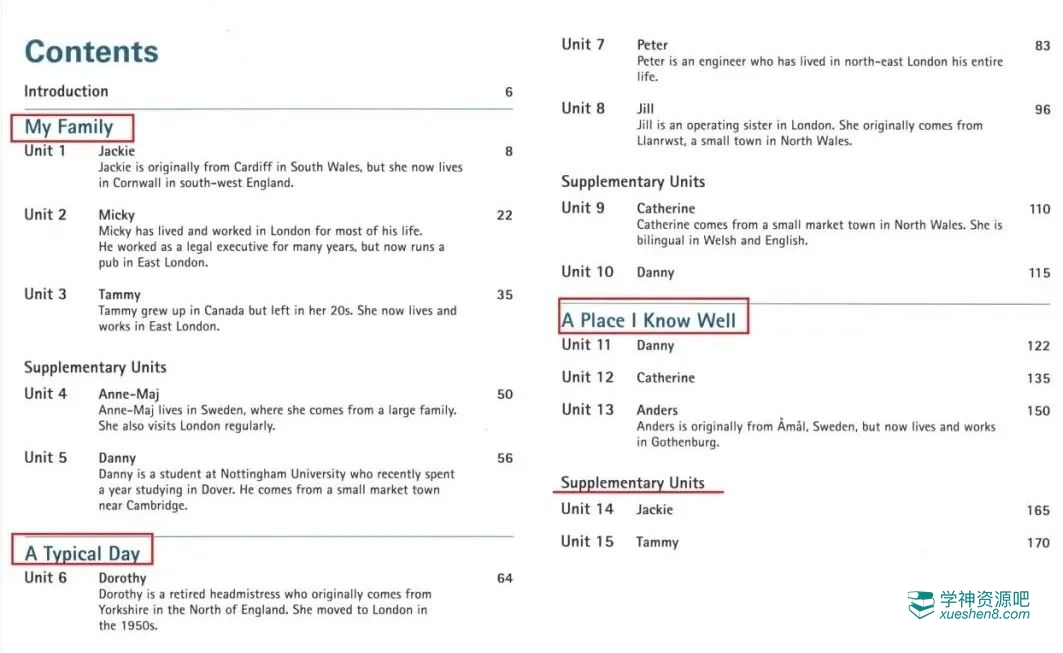 每个级别15个单元,分三个主题:我的家人、一个难忘的日子、一个熟悉的地方。
