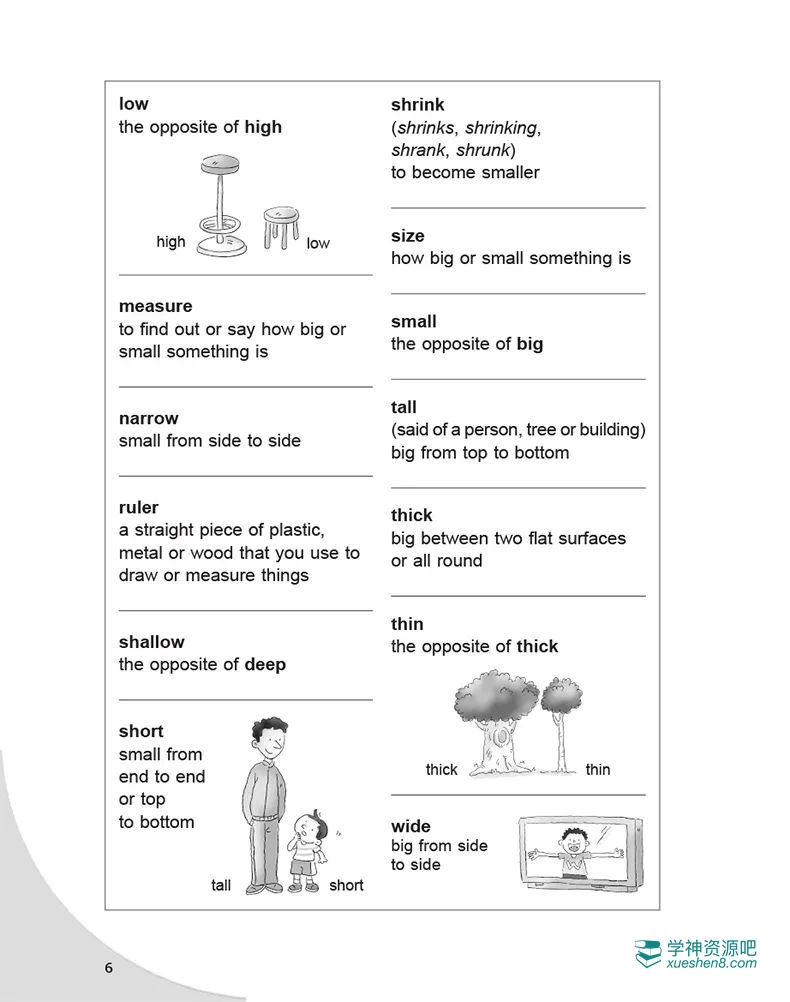 全套书共六册,每册书15-20个情景单元,涵盖生活中的不同主题。每个单元都包含主题词汇列表、词汇英文释义及相对应的练习题,附答案。