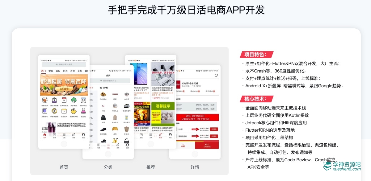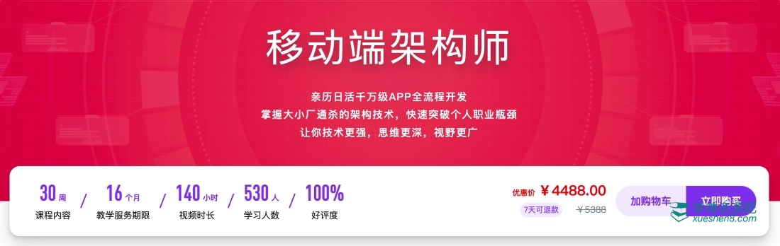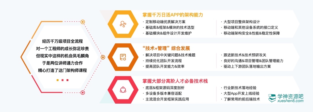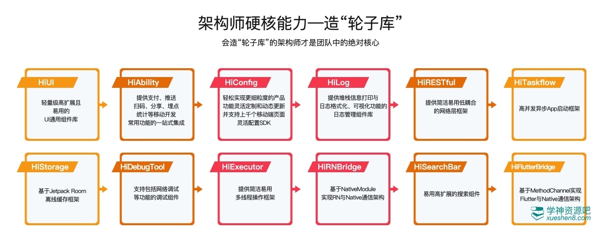 在开启系统化成长之前,先要明确移动端架构师需要具备的技术栈与能力,架构师在架构中大型APP及技术选型时,有哪些方法论可以遵循,本周还会带你认识讲师们为课程量身定制的开发套件,最后让我们一起通过千万级电商“好物”项目的HiLog“战役”燃起架构师成长之路吧。