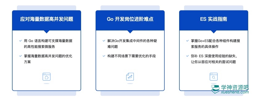 课程围绕实际工作中的问题展开讲解,助你完成 Go 语言搜索服务的开发与维护