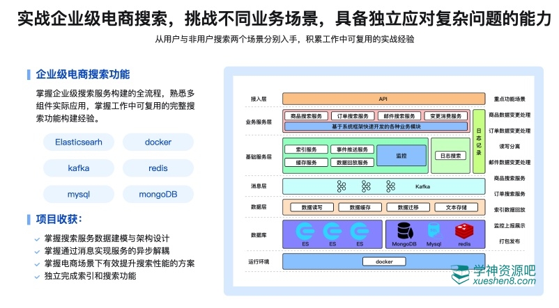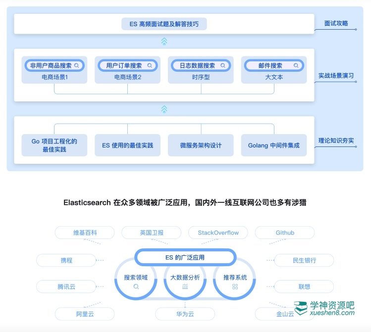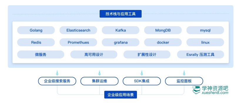 有应用的地方就会有搜索,有搜索的地方就能使用 Elasticsearch 来实现,Elasticsearch 用起来简单,但想要做好还是有很高的技术门槛的。要用 Go语言构建搜索服务,并完成海量数据的优化方案,缺乏经验就会有诸多问题暴露,难免走弯路。本课程通过对基础技能到实战项目的深度解读,带你夯实 ES+Go 的底层技能,积累实战经验,一举跃升经验丰富的 Go 语言开发者。