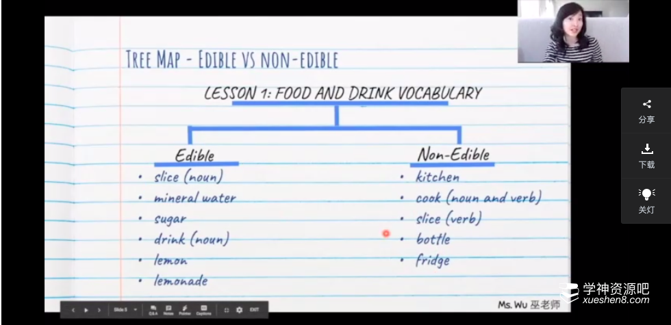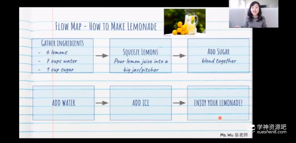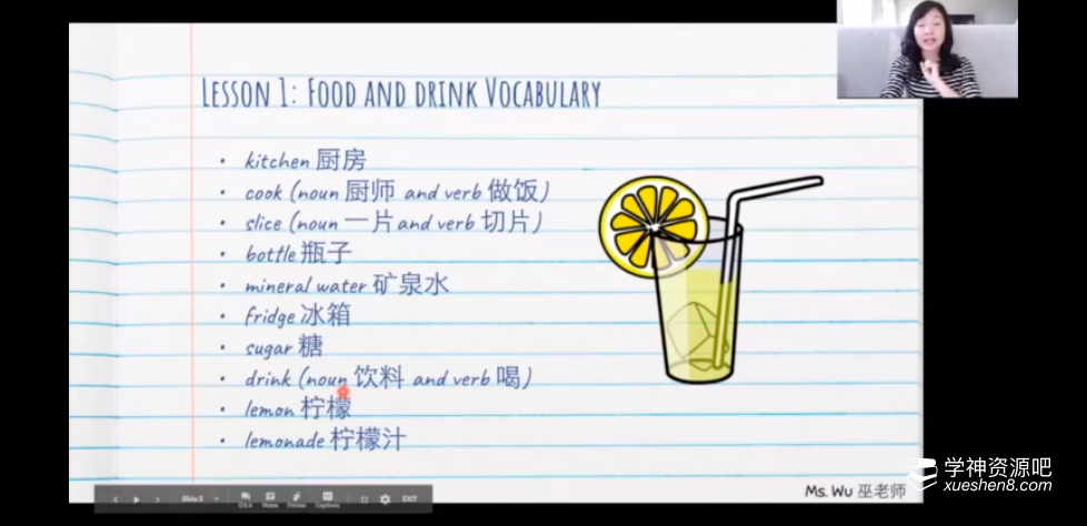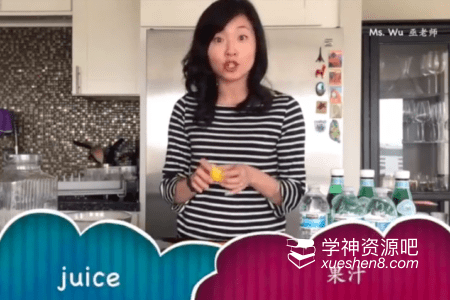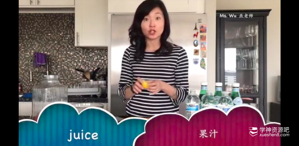 比如这节课,food and drink,那么老师就真的走进厨房,真的做一遍柠檬汁。老师会把单词融入到场景中,一边动手操作,一边讲解单词。