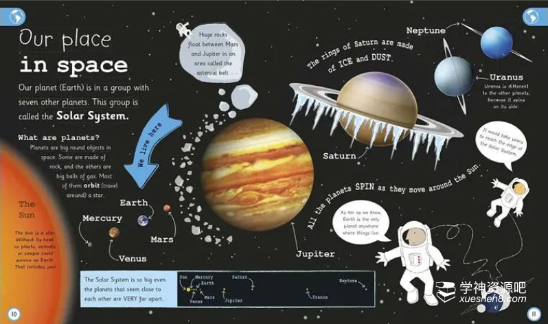 书的内容围绕儿童身边重要的事物叙述,从《地球》《人类》《动物》《恐龙》四大主题出发,内容包罗万象,把枯燥难以理解的知识,像讲故事一样生动有趣的呈现在大家的面前,带孩子们越过山川,跨过河流,飞向外太空,去探索我们这颗神奇的星球,这个茫茫宇宙中我们唯一的家园。