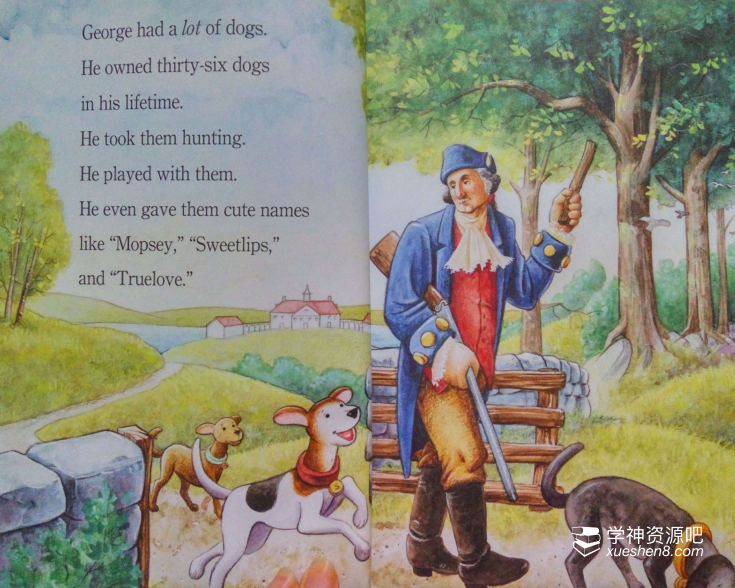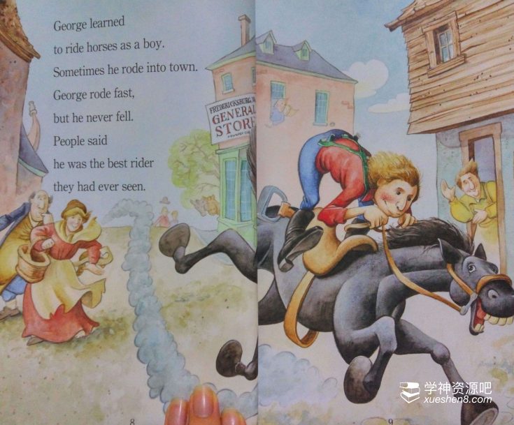 Step3和1、2相比,已经由句子过度到段落。并且随着孩子语言水平的提高,可以开始读一些实用性强的历史科普或者社会热点话题内容了。所以这个阶段的阅读素材,主题非常丰富多彩。例如《George Washington and The general's dog》这本,讲的是与美国总统华盛顿有关的历史故事:
