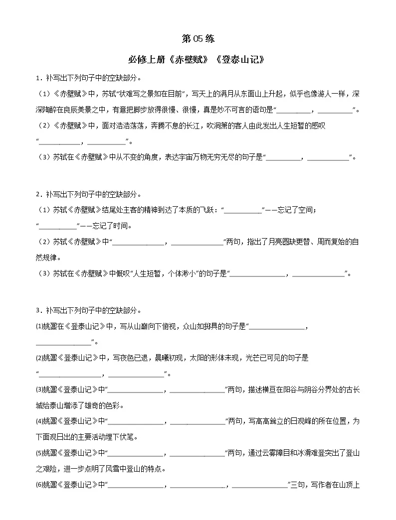 第05练 必修上册《赤壁赋》《登泰山记》理解性默写