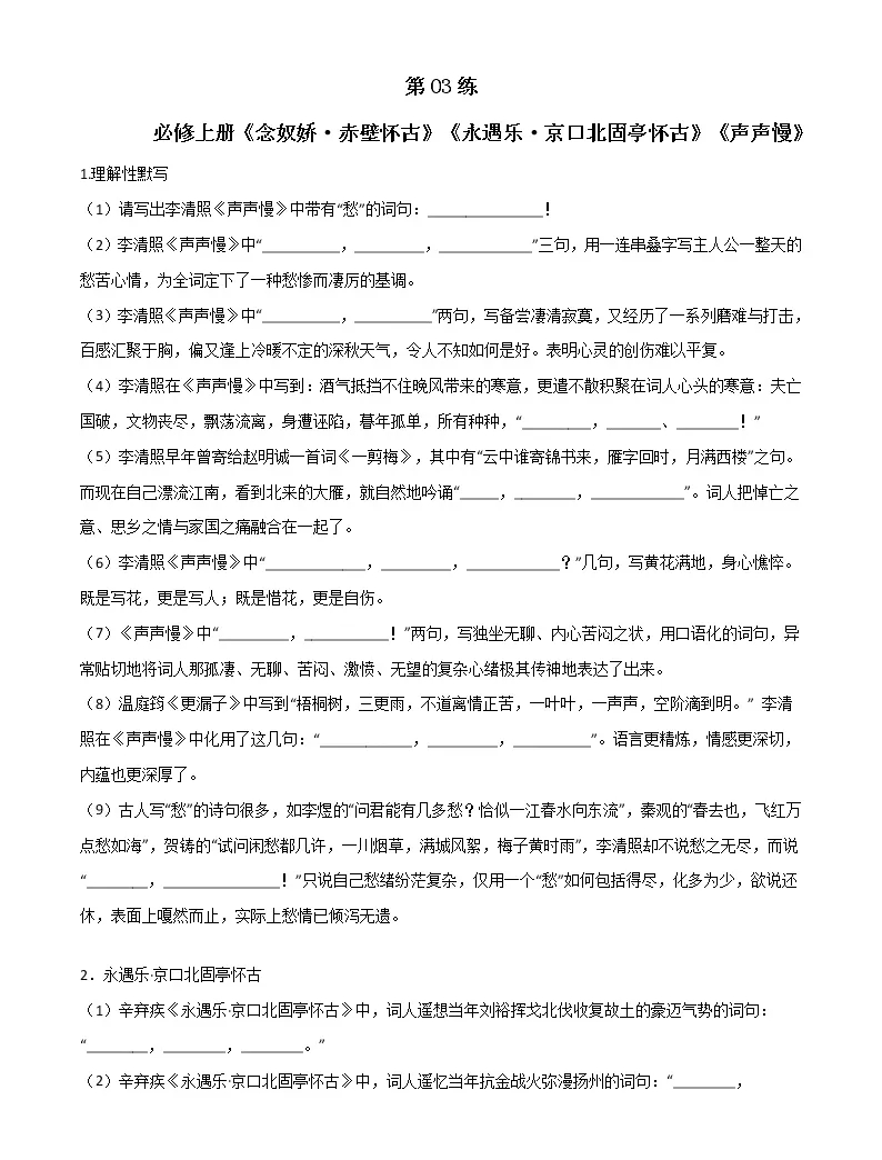 第03练 必修上册《念奴娇·赤壁怀古》《永遇乐·京口北固亭怀古》《声声慢》理解性默写