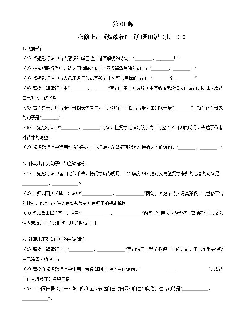 第01练 必修上册《短歌行》《归园田居(其一)》理解性默写