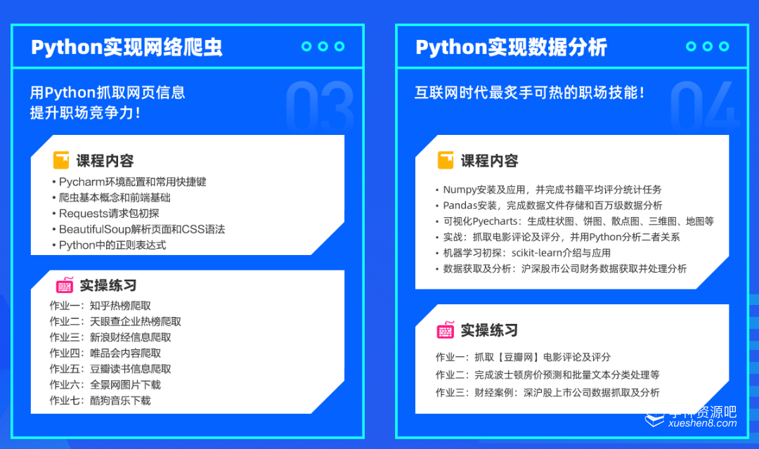 课程一共分为python零基础入门、python实现办公自动化、python实现网络爬虫、python实现数据分析4大模块实操教程以及28个专题包括作业测试和代码练习。