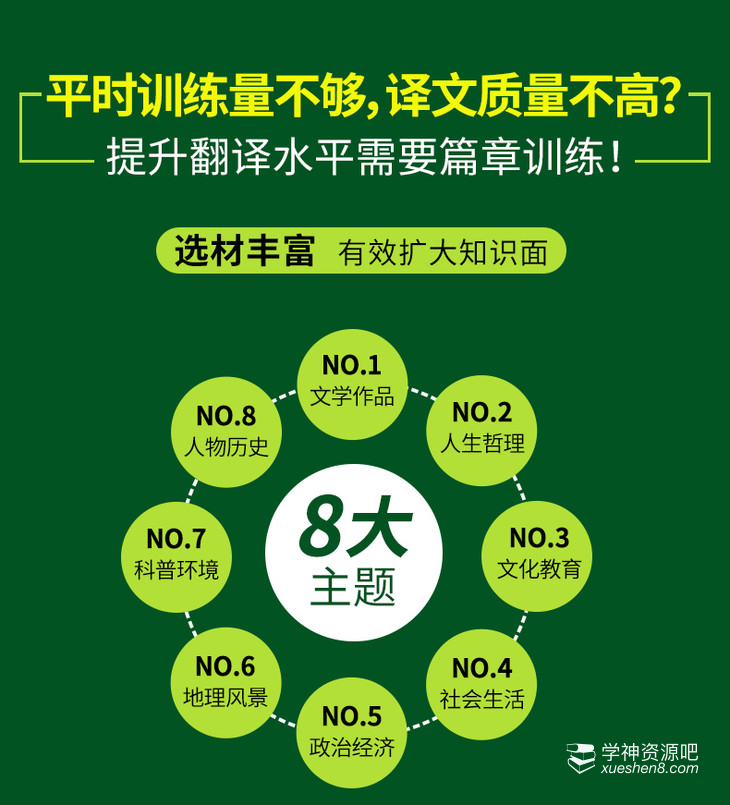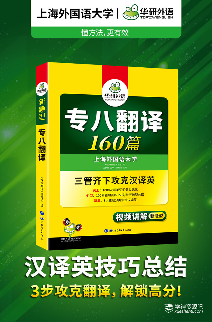 3.专八翻译8大汉译英主题分类训练,拓展考生的知识面;