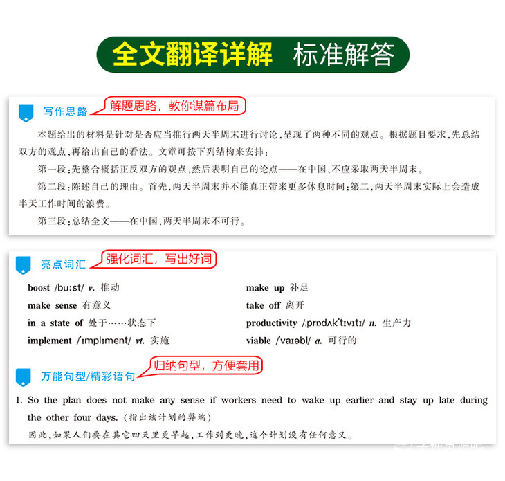 3.解析详细,除了提供范文,还包括写作思路、全文翻译、亮点词汇、句型/精彩语句等;