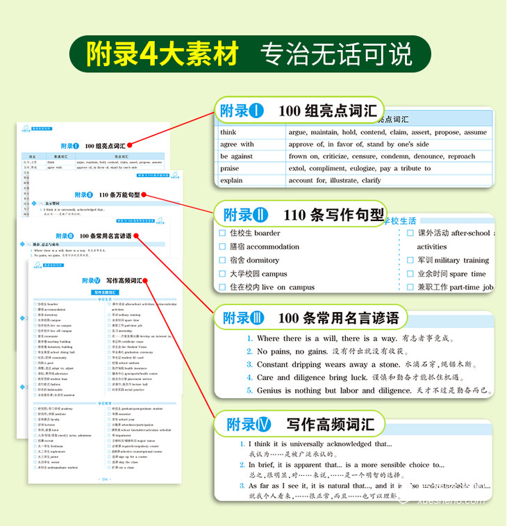 7.归纳英语专四写作亮点词汇、句型、名言谚语、写作高频词汇等实用附录,方便考生储备各种写作素材。