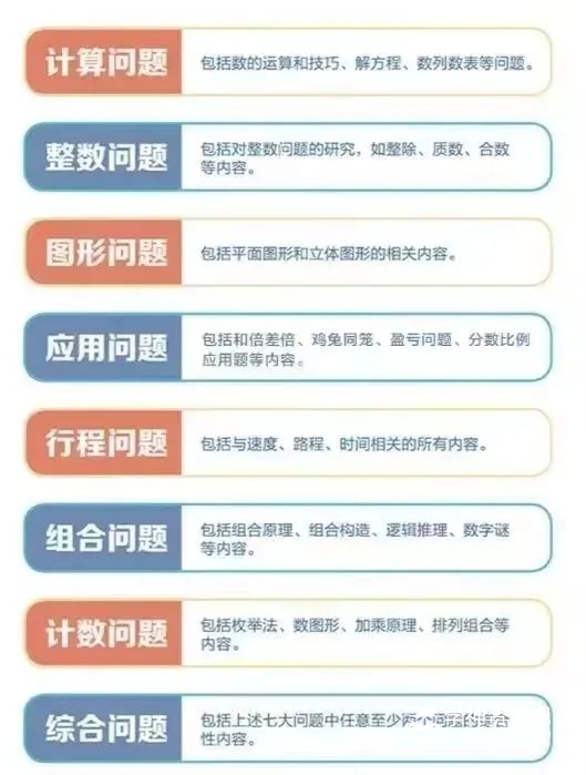 每一级课程会学习哪些内容?结合专家的建议和数学能力培养的需要,学而思课程体系把整个小学阶段需要掌握的内容分成了八大问题:计算问题、整数问题、图形问题、应用问题、行程问题、组合问题、计数问题和综合问题。
