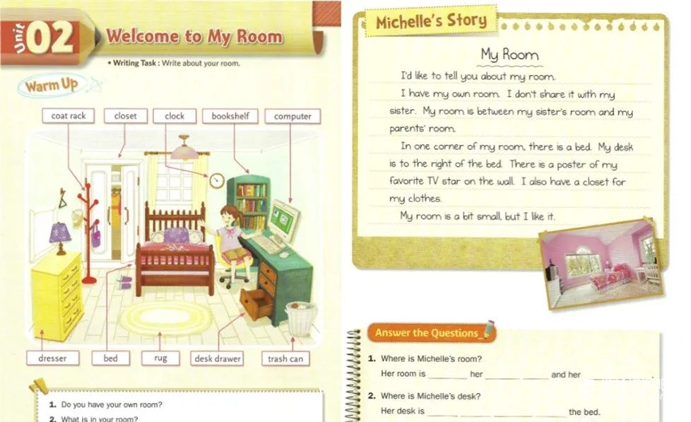 第一部分帮助学生理解话题,对话题产生兴趣,也会介绍一些新的单词。用基础的问题提问,让学生对该话题产生感悟和讨论。给出范文让学生对于自己的作文有一个大体的样板。针对范文用问题检测学生是否理解了文章。