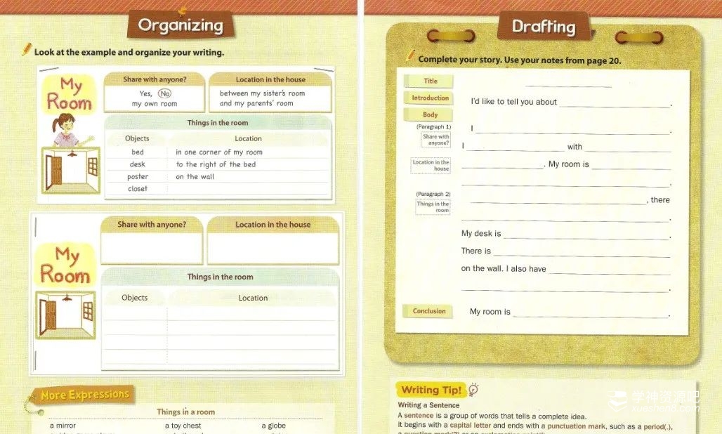 让学生理解作文结构,开始组织他们自己的作文。提供一些学生在作文中可以使用的其他表达。第一份草稿是根据已经给出的结构和信息来动笔。
