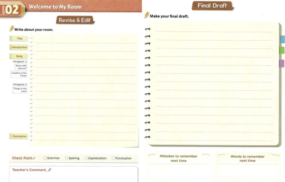 脱离模板,写下完整的作文。写完后试着去查找语法、拼写、标点符号的错误。修改完作文后再次誊写,成为最终的定稿。学生记下核心词汇,以及错误点避免以后再发生。