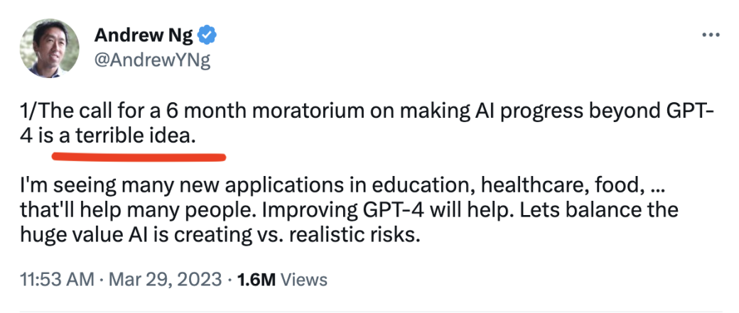 吴恩达认为暂停AI训练的想法很糟糕。因为他已经在教育、医疗保健、食品等领域看到了很多新的AI应用,让许多人受益。