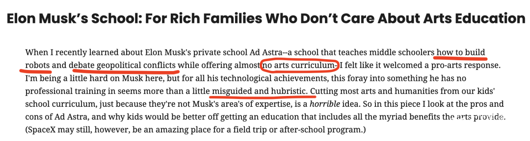 这些也不学,家长们就觉得不可思议了,吐槽的很多。比如这位说“马斯克这家教娃造机器人和辩论的学校,居然没有艺术课程……真是有点儿盲目和自负……”