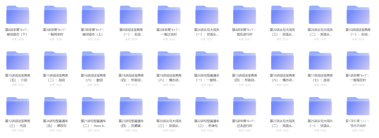 课程覆盖中小学阶段必会的语法知识点,将六大时态、五大句型、词法大全、被动语态、三大从句五大知识板块全部一网打尽。