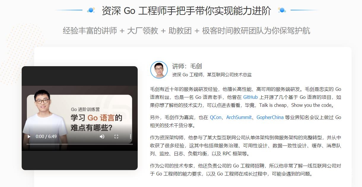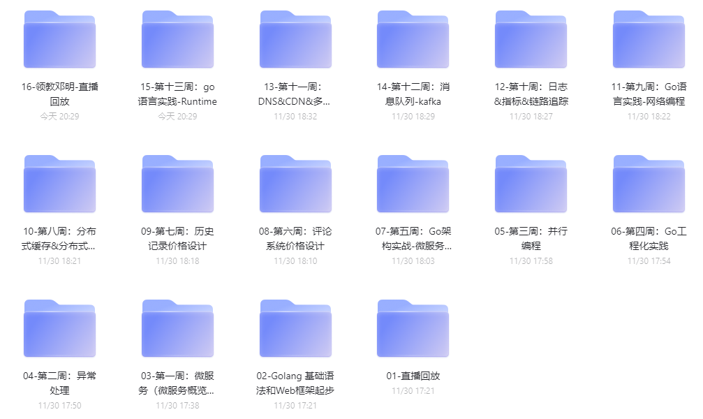 ——/Go进阶训练营4期(完结)/ ├──01-直播回放 | └──开营直播.mp4 2.66G ├──02-Golang 基础语法和Web框架起步 | ├──1.基础语法.mp4 3.23G | ├──2.type 定义与 Server 抽象.mp4 3.69G | ├──3.错误处理与简单路由树实现.mp4 4.41G | └──4.并发编程、文件操作与泛型1.mp4 8.13G ├──03-第一周:微服务(微服务概览与治理) | ├──1. 微服务概览与治理(2)(2).pptx 22.35M | ├──1.微服务概览.mp4 808.12M | ├──2.微服务设计.mp4 1.35G | ├──3.gRPC & 服务发现.mp4 1.60G | └──4.多集群 & 多租户.mp4 1014.32M ├──04-第二周:异常处理 | ├──1.Error vs Exception.mp4 774.27M | ├──2. Go语言实践 - error.pptx 9.64M | ├──2.Error Type.mp4 471.72M | ├──3.Handling Error.mp4 970.36M | └──4.Go 2 Error Inspection.mp4 310.99M ├──05-第三周:并行编程 | ├──1.Goroutine.mp4 1.15G | ├──2.Memory model.mp4 752.85M | ├──3. Go语言实践 - concurrency.pptx 15.67M | ├──3.Package sync.mp4 1.63G | └──4.Package context.mp4 1.80G ├──06-第四周:Go工程化实践 | ├──1.工程项目结构.mp4 2.35G | ├──2.API 设计.mp4 1.38G | ├──3.配置管理.mp4 869.17M | ├──4. Go 工程化实践.pptx 16.15M | └──4.模块单元测试.mp4 779.64M ├──07-第五周:Go架构实战-微服务(微服务可用性设计) | ├──1. 隔离.mp4 1.16G | ├──2.超时.mp4 1.02G | ├──3.过载保护和限流.mp4 2.13G | ├──4.降级&重试.mp4 627.75M | ├──5. 微服务可用性设计.pptx 5.24M | └──5.重试和负载均衡.mp4 770.44M ├──08-第六周:评论系统价格设计 | ├──1. 隔离.mp4 1000.54M | ├──1.功能和架构设计.mp4 1.63G | ├──2.超时.mp4 911.90M | ├──2.存储和可用性设计.mp4 1.46G | ├──3.过载保护和限流.mp4 2.06G | ├──4.降级&重试.mp4 543.98M | ├──5.重试和负载均衡.mp4 771.78M | └──6. 评论系统架构设计.pptx 2.14M ├──09-第七周:历史记录价格设计 | ├──1.功能模块与架构设计.mp4 1.27G | ├──2.存储设计与可用性设计.mp4 958.27M | └──7. 播放历史架构设计.pptx 2.29M ├──10-第八周:分布式缓存&分布式事务 | ├──1.分布式缓存.mp4 1.65G | ├──2.分布式事务.mp4 1.03G | └──8. 分布式缓存&分布式事务.pptx 3.75M ├──11-第九周:Go语言实践-网络编程 | ├──1.网络通信协议.mp4 1013.25M | ├──2.Goim 长连接网关.mp4 891.50M | ├──3.IM 私信系统.mp4 273.48M | └──9. Go语言实践 - 网络编程.pptx 9.26M ├──12-第十周:日志&指标&链路追踪 | ├──1.日志.mp4 772.72M | ├──10. 日志&指标&链路追踪.pptx 2.89M | ├──2.链路追踪.mp4 821.05M | └──3.指标.mp4 162.31M ├──13-第十一周:DNS&CDN&多活架构 | ├──1.DNS和CDN.mp4 515.30M | ├──11. DNS & CDN &多活架构.pptx 12.13M | └──2.多活.mp4 922.55M ├──14-第十二周:消息队列-kafka | ├──1.Topic & Partition.mp4 1.05G | ├──12. 消息队列 Kafka.pptx 4.56M | ├──2.Producer & Consumer.mp4 827.11M | └──3.Leader & Follower.mp4 1.13G ├──15-第十三周:go语言实践-Runtime | ├──1.Goroutine原理.mp4 1.33G | ├──13. Go语言实践 - Runtime.pptx 7.93M | ├──2.内存分配原理.mp4 1.27G | ├──3.GC 原理.mp4 786.88M | ├──4.Channel 原理.mp4 274.49M | └──Undeerstanding channels.pdf 437.81kb └──16-领教邓明-直播回放 | ├──01. 微服务概览与治理-领教.pdf 1.79M | ├──01.9月5日领教直播-微服务概览与治理.mp4 2.32G | ├──02. Go语言实践 - error领教.pptx 719.80kb | ├──02.9月12日领教直播-Go 语言实践-Error.mp4 1.83G | ├──03. Go语言实践 - concurrency-领教.pdf 2.19M | ├──03.9月19日领教直播-Go 语言实践-Concurrency.mp4 2.08G | ├──04.9月26日领教直播-Go 工程化实践.mp4 2.22G | ├──04.9月26日领教直播-Go 工程化实践.pdf 1.67M | ├──05. 微服务可用性设计-答疑.pdf 803.67kb | ├──05.10月10日领教直播-微服务可用性.mp4 2.54G | ├──06.10月17日领教直播-评论系统架构设计 (2).pdf 2.56M | ├──06.10月17日领教直播-评论系统架构设计.mp4 1.60G | ├──06.10月17日领教直播-评论系统架构设计.pdf 2.56M | ├──07.10月24领教直播-播放历史架构设计.mp4 1.81G | ├──08. 分布式缓存&分布式事务(2).pdf 673.68kb | ├──08.10月31日领教直播-分布式缓存 & 分布式事务.mp4 2.27G | ├──08.10月31日领教直播-分布式缓存 & 分布式事务.pdf 1.82M | ├──09.11月7日领教直播-网络编程(1).mp4 1.70G | ├──09.11月7日领教直播-网络编程(1).pdf 750.48kb | ├──10.11月14领教直播-日志&指标&链路追踪.mp4 13.21G | ├──12. 消息队列 Kafka.pdf 1.97M | └──12.11月28日领教直播-Kafka.mp4 1.76G