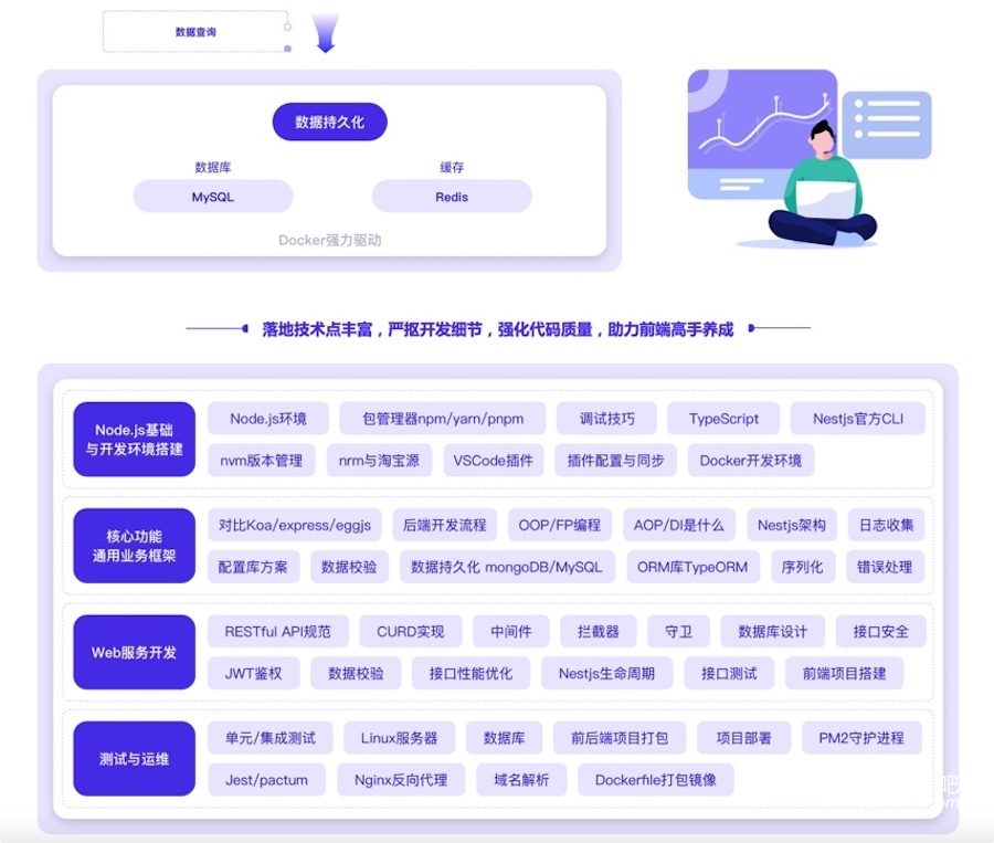 TypeScript已是前端开发语言趋势,企业在招聘前端时都要求熟练掌握TS。本章结合现实的使用场景,由浅入深的介绍了TS的核心技术:类型、函数、对象、泛型等,让大家后续学习Nestjs的过程更顺畅。