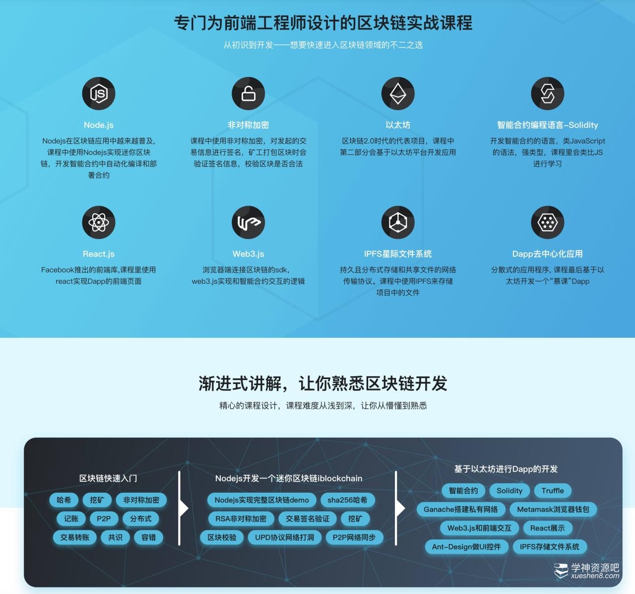 在本课程中,我们将从区块链原理入手,使用Nodejs进行区块链开发,并通过实战项目的开发帮助你掌握区块链的技术原理、以太坊的开发技能和项目开发流程。让你成为一个懂区块链也能开发区块链的前端开发者。