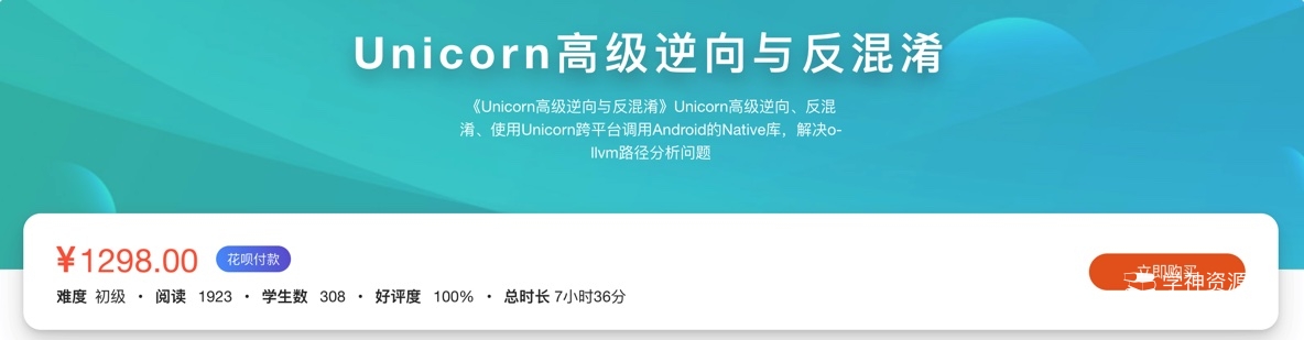 看雪安卓高级逆向 Unicorn高级逆向与反混淆,当你走进逆向的大门,学得越多,就会发现还有更多自己不懂的知识,等待去挖掘。当逆向和Unicorn碰撞,热门行业就此产生,掌握Unicorn高级逆向和反混淆,升职加薪不是梦!本课程主要学习使用Unicorn解决实际问题,比如模拟调用Android的Native库(Jni)、跨平台调用ARM代码、o-llvm 基本块之间的关系分析、去除花指令、以及Unicorn的调试技巧。