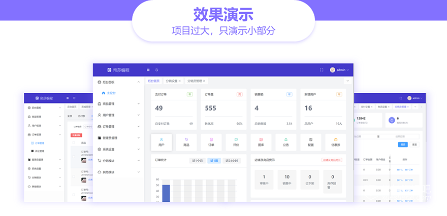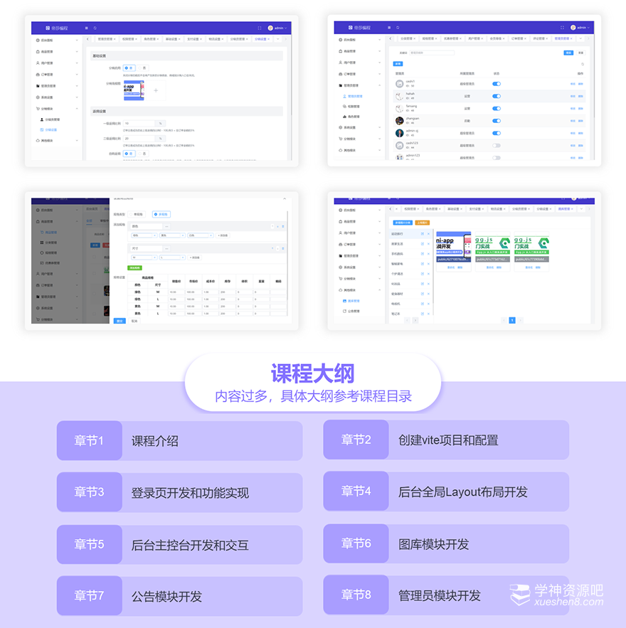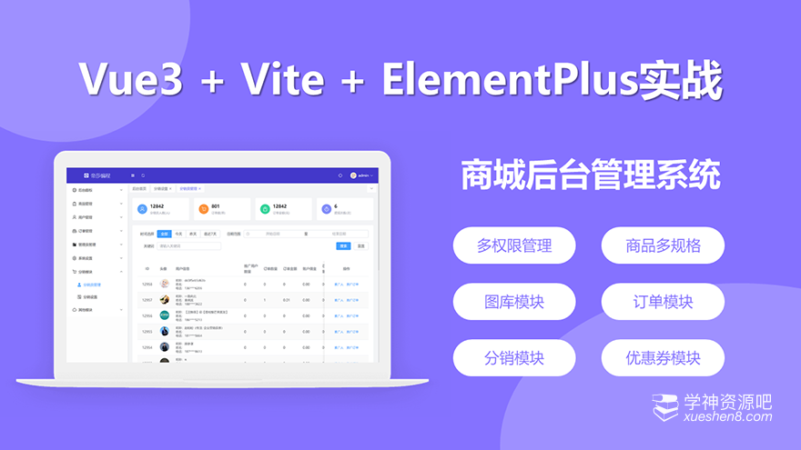 本季度基于Vue3 ElementPlus Vite实战开发商城后台管理系统,其中包括Vite的使用,Vue3全新的 setup语法糖,vuex4、Vue-router4、使用ElementPlus 库、多权限管理、商品多规格实现、订单发货、导出订单、图库模块、分销模块、分享海报以及部署服务器上线知识等。
