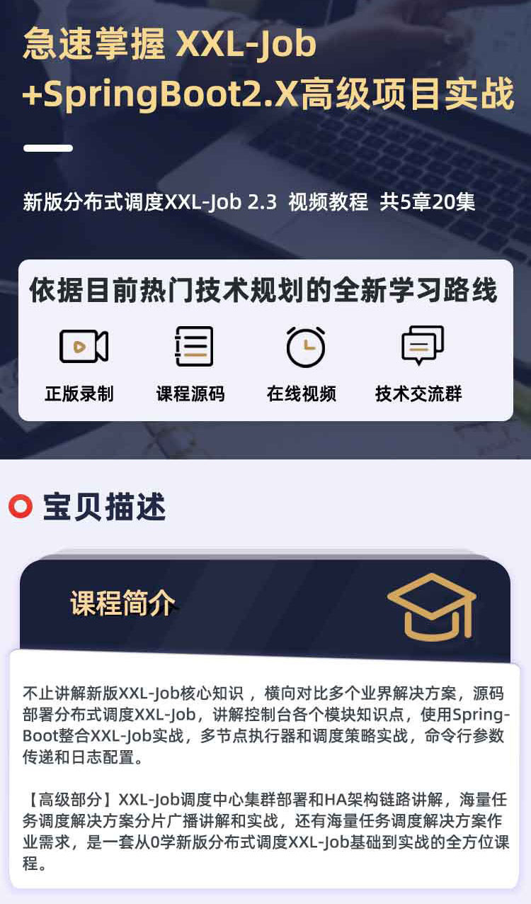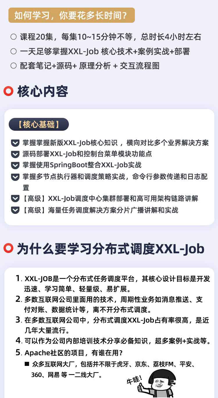 不止讲解新版XXL小ob核心知识,横向对比多个业界解决方案,源码部署分布式调度XXL-Job,讲解控制台各个模块知识点,使用Spring Boot整合XXL-Job实战,多节点执行器和调度策略实战,命令行参数传递和日志配置。