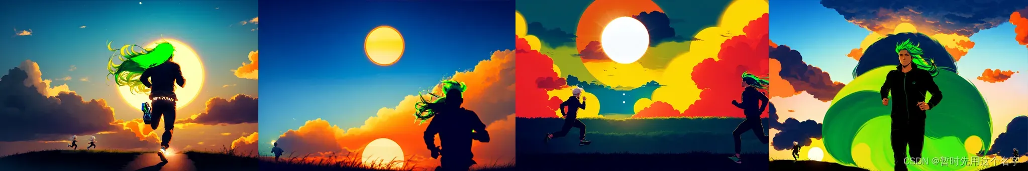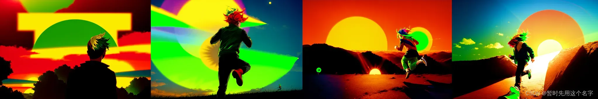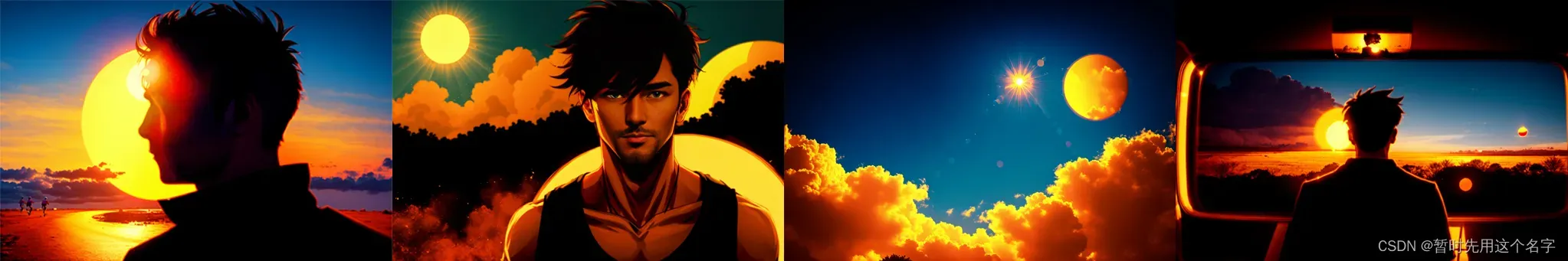 橙色太阳和蓝色天空因为权重一致了,所以基本都会同时出现在画面中(看云:似乎AI想把橙色和蓝色都嵌入到其中,第三图似乎更是想生硬地把他们都捏在一起,而这种感觉在前几个例子的图片是没有的)。