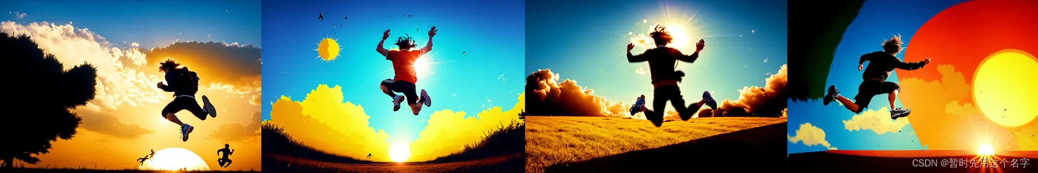 (absurdres), 8k, comic, ((viewfinder)), 1male, running, (jumping:1.5), black hair, orange sun, blue sky,