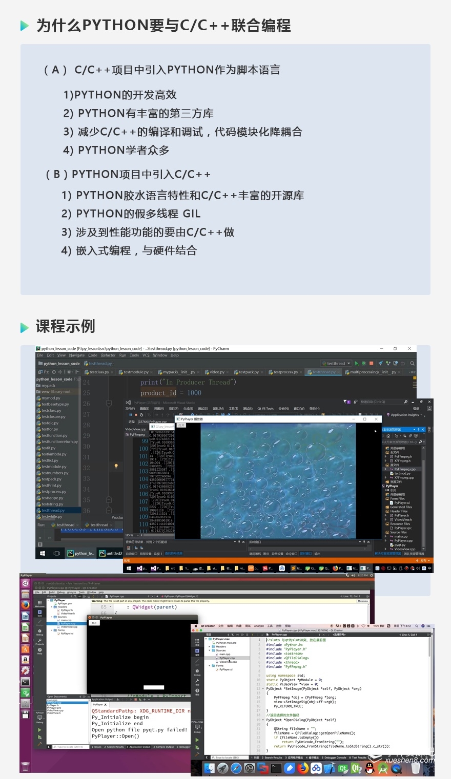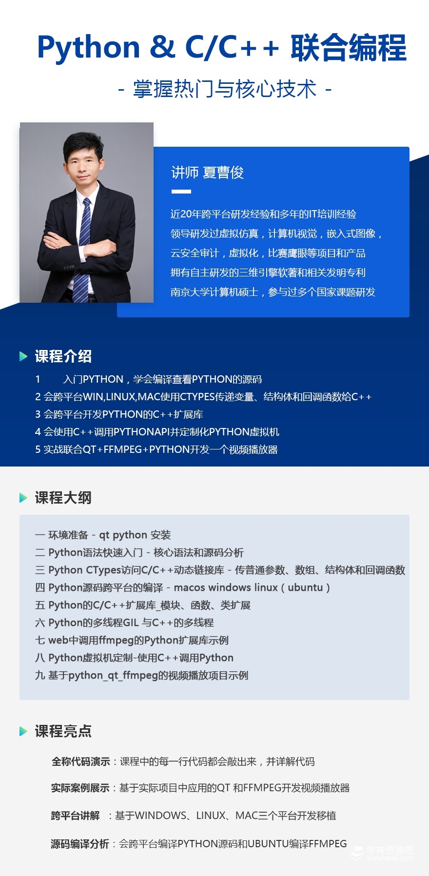 快速入门python,学习编译查看Python的源码 ;会跨平台win,linux,mac使用ctypes传递变量、结构体和回调函数给c++ ; 会跨平台开发python的c++扩展库; 会使用c++调用pythonAPI并定制化python虚拟机 ;实战联合qt+ffmpeg+python开发