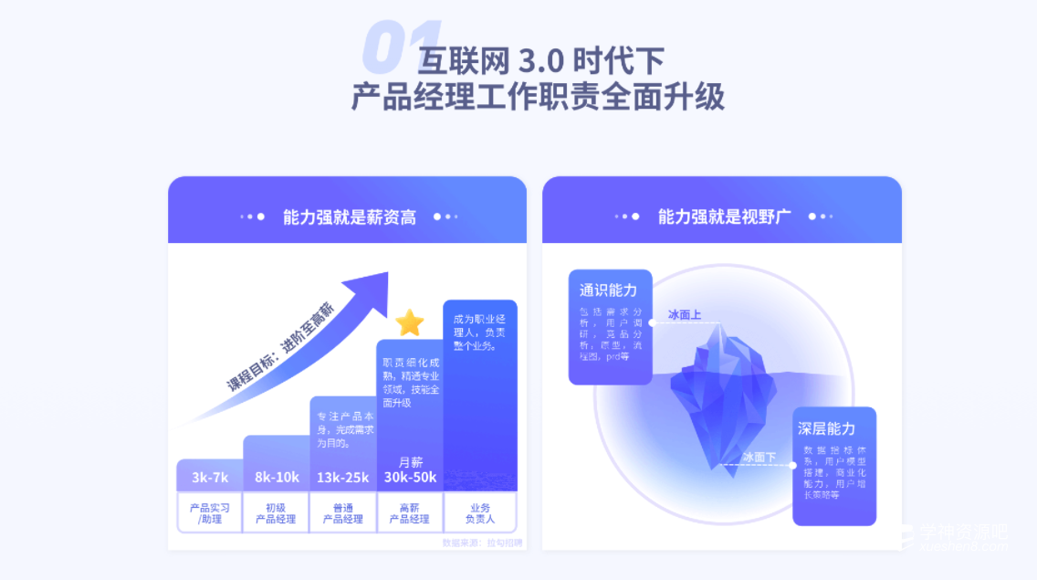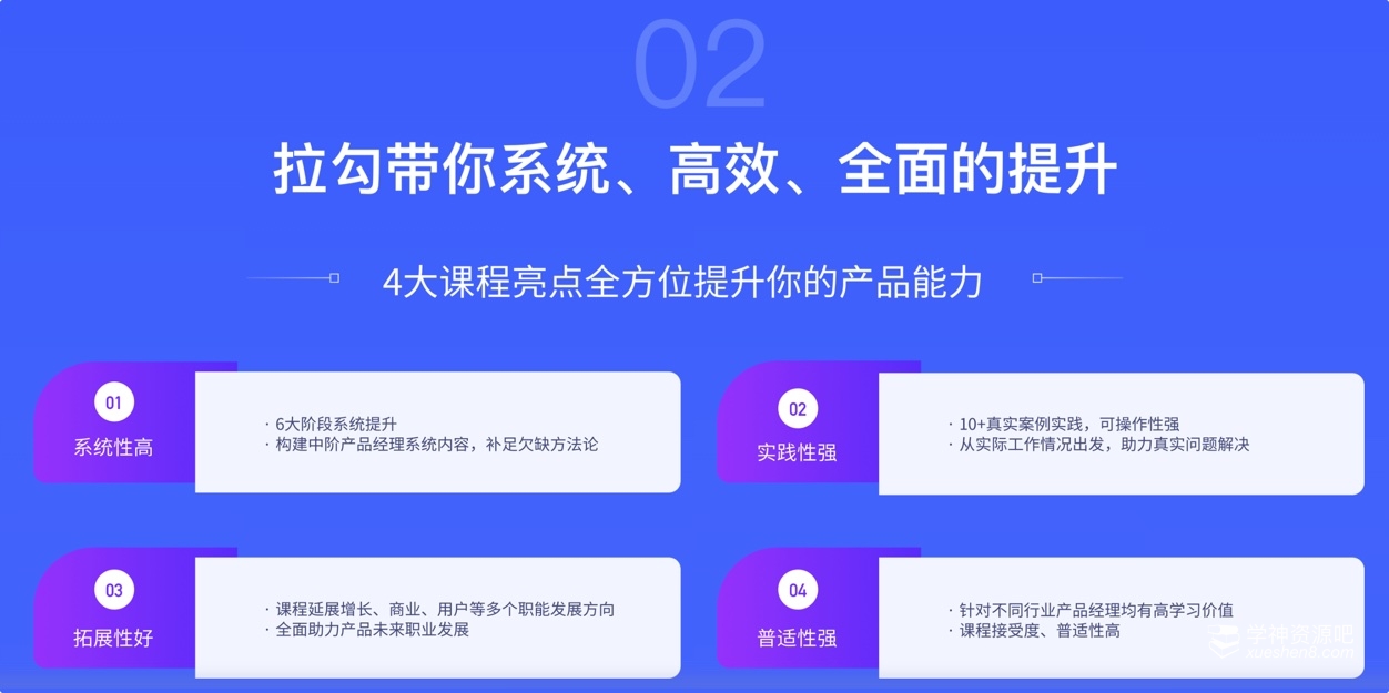 对标腾讯10 职级能力,成为能打能赢的产品人.用户,数据,增长,商业,运营多维度覆盖.六大阶段精准应对六大工作职能,每个模块都是职业发展新方向:产品经理用户体系篇,产品经理数据指标篇,数据分析实战篇,用户增长篇,商业变现篇,产品运营篇.