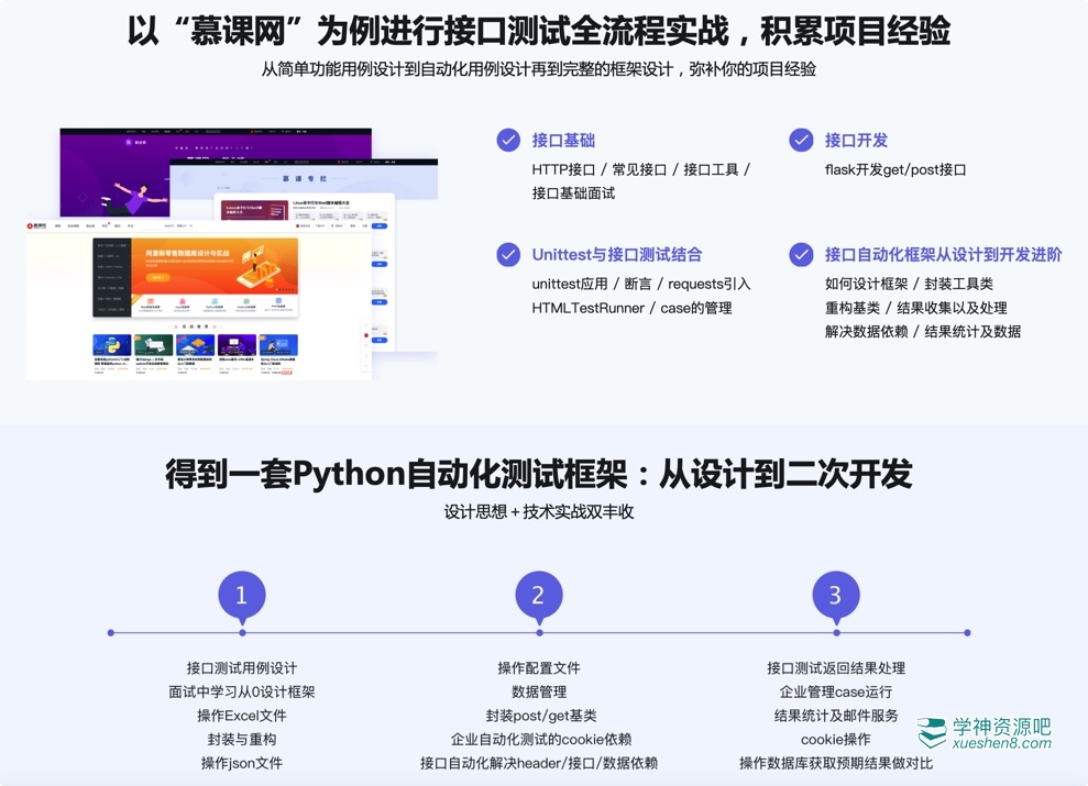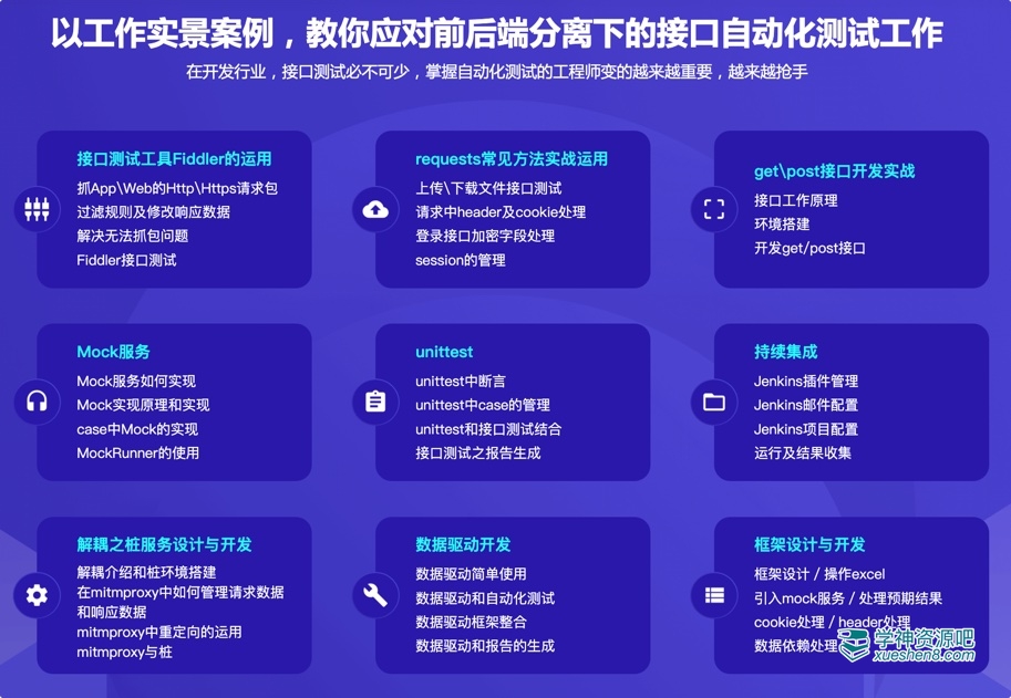 课程从接口基础知识讲起,覆盖:抓包+接口工具的运用+常见接口库+接口开发+Mock服务+unittest框架的运用+接口测试框架的设计、开发+持续集成, 最后开发一套前后端解耦过程中需要用到的桩服务来完成我们整个接口自动化测试框架的学习。