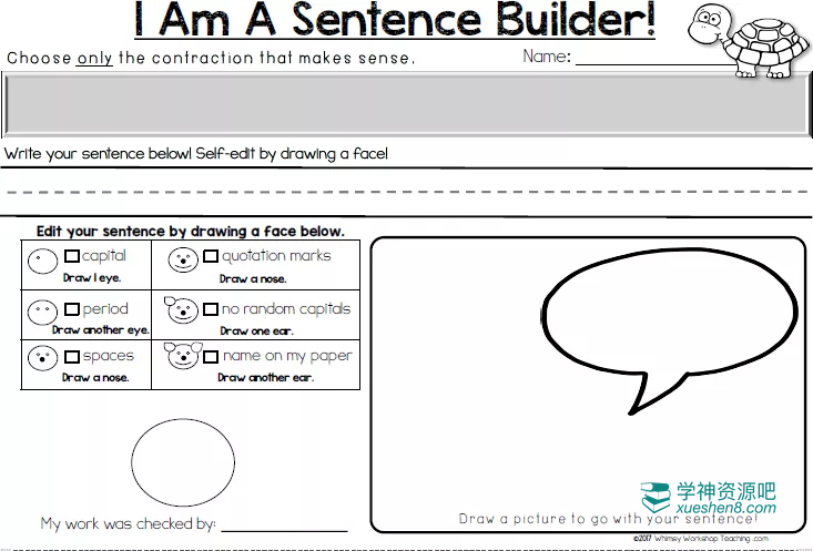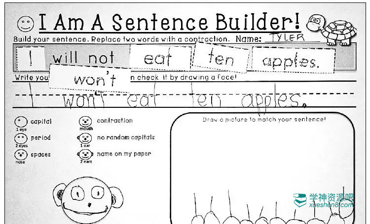 上方的步骤都完成以后就到了画图的环节,孩子需要在右侧的框框中画出与句子内容匹配的图片。这一步可以检验孩子是否真正理解所学句子的含义。