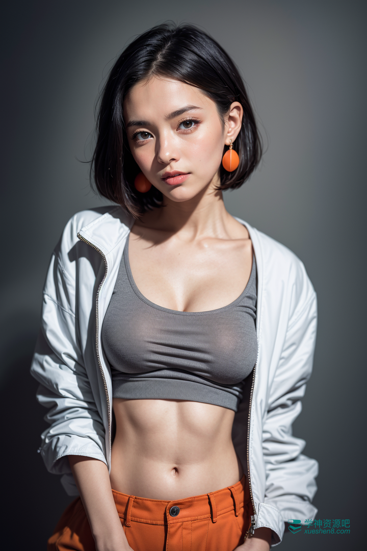 fashion photography portrait of 1girl, Utility jacket, high-waisted shorts, ankle boots, solo, [:(detailed face:1.2):0.2], midriff peek, medium breasts, breasts,jewelry,earrings, very short hair, upper body, grey eyes, looking at viewer,black hair,(head tilt:1.2), lips, slightly smile, red background, simple background, orange_sky, 4k, high-res, masterpiece, best quality, ((Hasselblad photography)), finely detailed skin, sharp focus, (cinematic lighting), soft lighting, dynamic angle