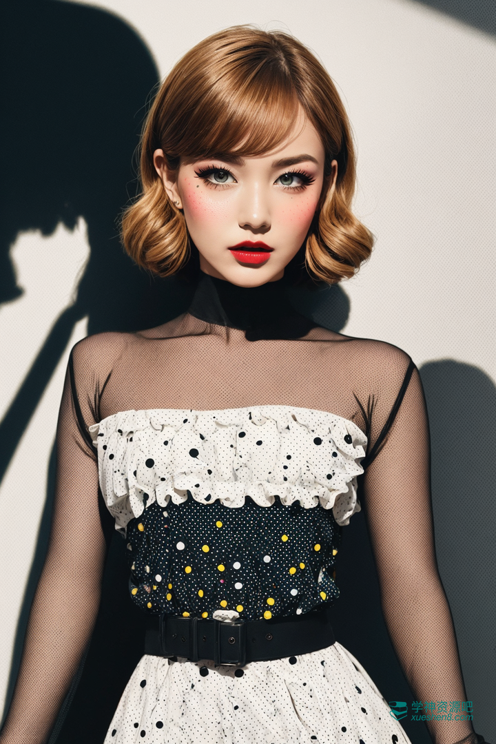 1girl is dressed and made-up in the style of a Roy Lichtenstein pop art cartoon. Her gown is polka-dotted, and her makeup features exaggerated dots, bright colors and speech bubbles. She has an animated, comic expression. The set is designed in the same style with benday dots, speech bubbles and "Pow!" graphics. The color palette is entirely retro dots - yellow, red and black. (RAW photo, best quality),(realistic, photo-realistic:1.3), clean, masterpiece,finely detail,masterpiece,ultra-detailed,highres,(best illustration),(best shadow),intricate, bright light.