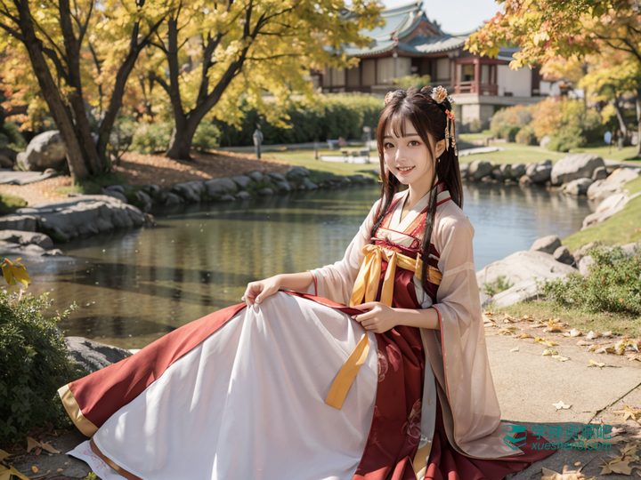 hanfu, tang style outfits, ,hanfu, tang style outfits, red long upper shan, red chest po skirt, purple pibo, orange waistband, 1girl, slender, brown hair, light smile, in autumn,