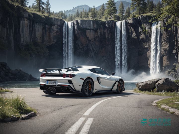 跑车、瀑布和公路。