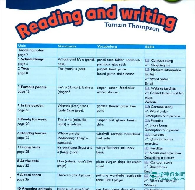 每册书约10个单元,每单元一个主题。每单元学习内容是一篇阅读 一个写作练习,从目录可以看出每单元需掌握的词汇、句式和读写技巧。