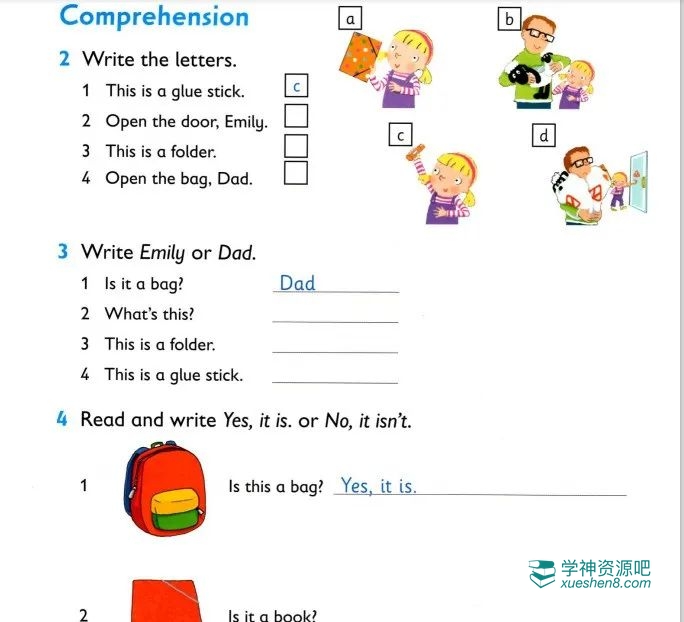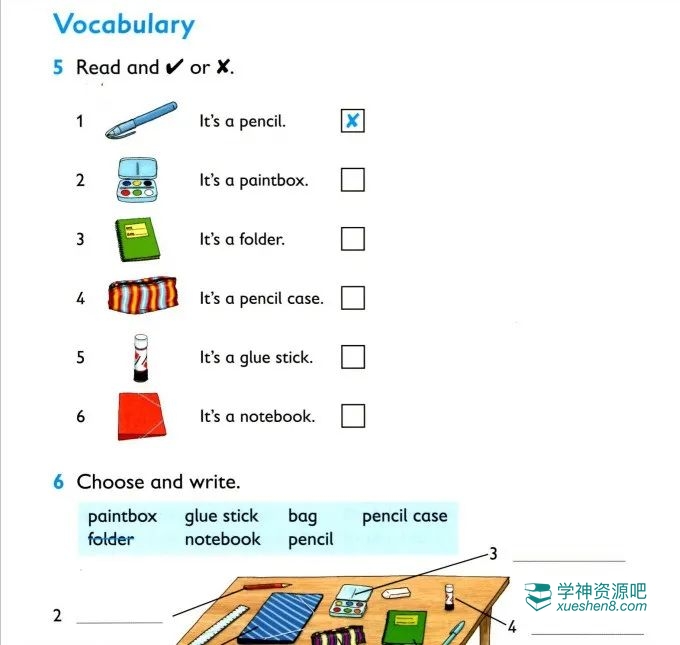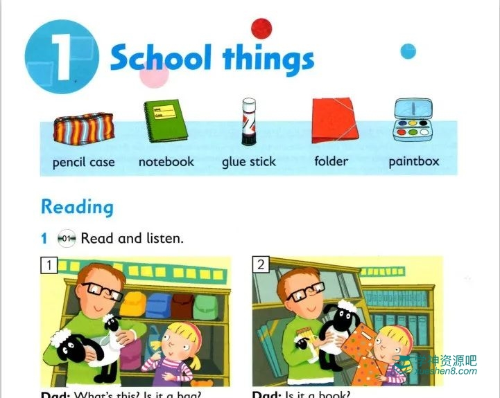第一册Unit1是关于孩子们熟悉的学习用具。每单元开篇配一个生词表,低阶的类似图解字典了。