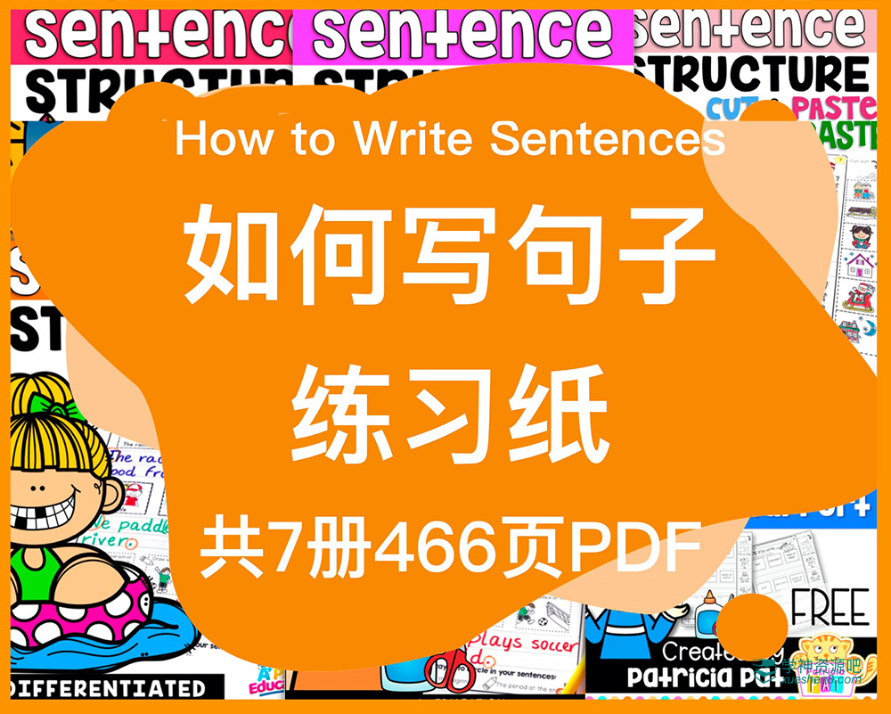 《How to Write Sentences Bundle》全套7册英文写作练习,练习句型结构配有图片,包含六册不同主题练习册和一册新增的补充练习册,由易到难共有两个级别,第一个级别句子图片有单词,第二个级别句子图片无单词提示。