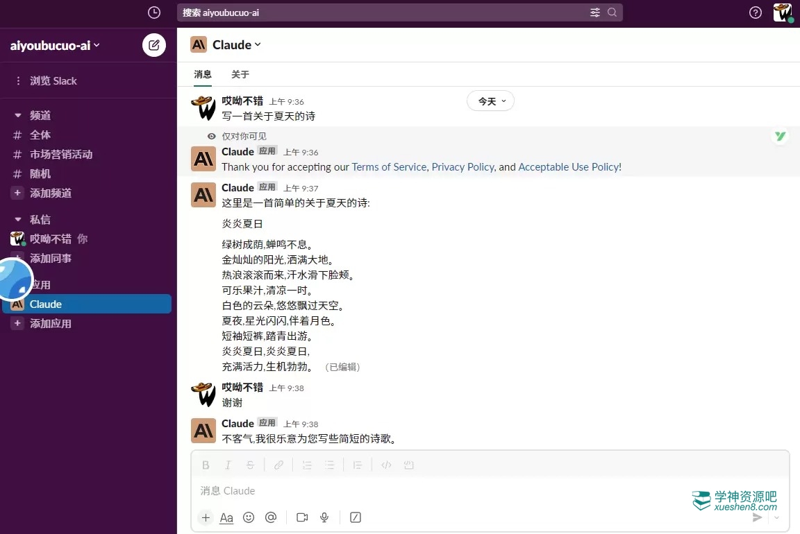Claude 并没有像 ChatGPT 那样开放官网供广大普通用户使用,而是将 AI 作为一款“应用插件”集成到「Slack」里去。Slack 是类似国内的飞书、企业微信、钉钉这样的团队协作办公平台,它本身在国内网络可以直接访问,同时还有网页版以及客户端,Claude 也因此得益。