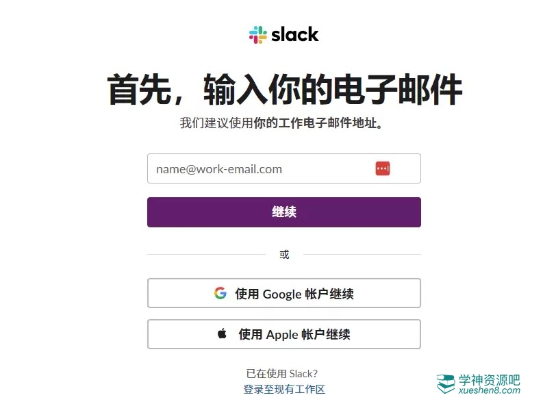 你可以使用邮箱「前往这里注册 Slack 账号」(你可以使用企业邮箱 或 Gmail、Outlook 等,实测 QQ 邮箱不支持),或者直接使用 Google、Apple 账号进行授权登录。在这里,我选择使用 Gmail 邮箱进行注册,验证了邮箱之后就能成功注册。