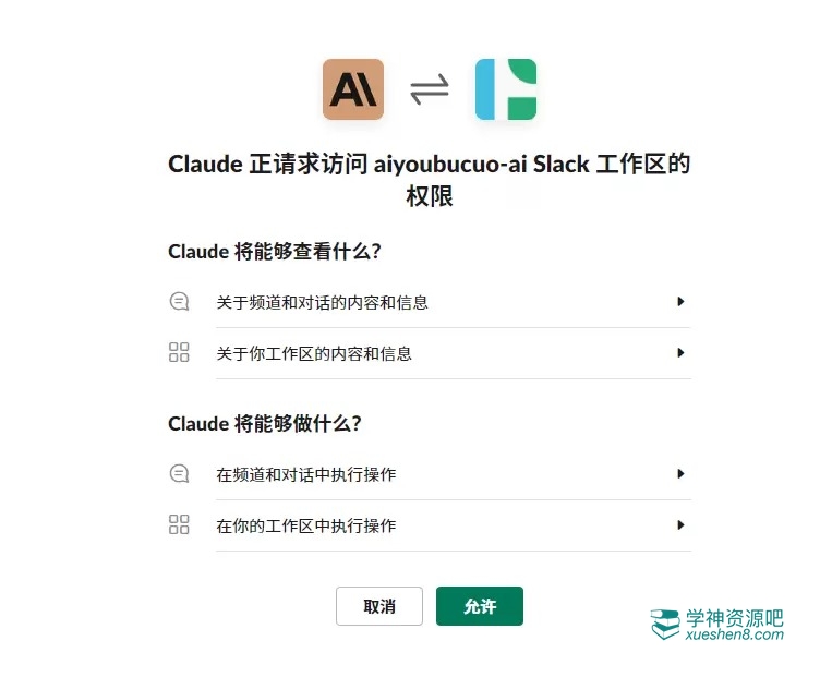 Slack 账号和工作区都准备好了就可以“一键安装 Claude”了。但现在你需要先准备一个美国 IP 的网络环境,然后「点击 Add to Slack 这个链接」即可在 Slack 里添加 Claude 机器人应用。看到对话框,点击“允许”给予权限即可,至此我们就已经全部搞定了,非常的简单!