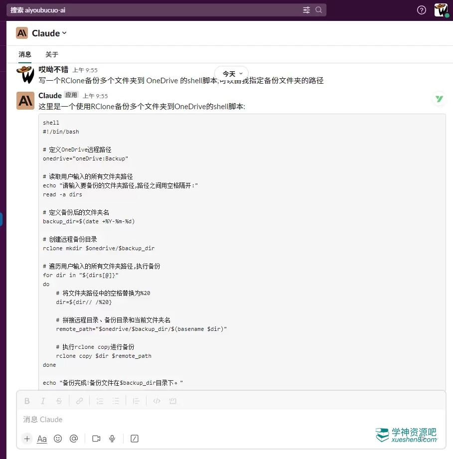 实际效果我测试了好几天,Claude 不仅逻辑还是连续对话(上下文)的理解能力都能让我满意,而且作为开发者,Claude 对编程的问题以及提供示例代码的能力也都不错,下面是我让 Claude 写一个“备份文件夹到 OneDrive 的脚本”,效果和 ChatGPT 其实不相上下了。
