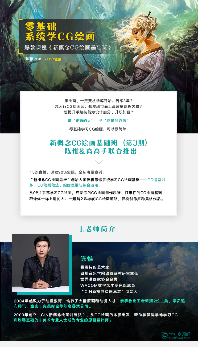 CG绘画,可以很简单~新概念CG绘画基础班(第3期)陈惟&高高手联合推出15次直播,课程90%实操,全新海量案例。