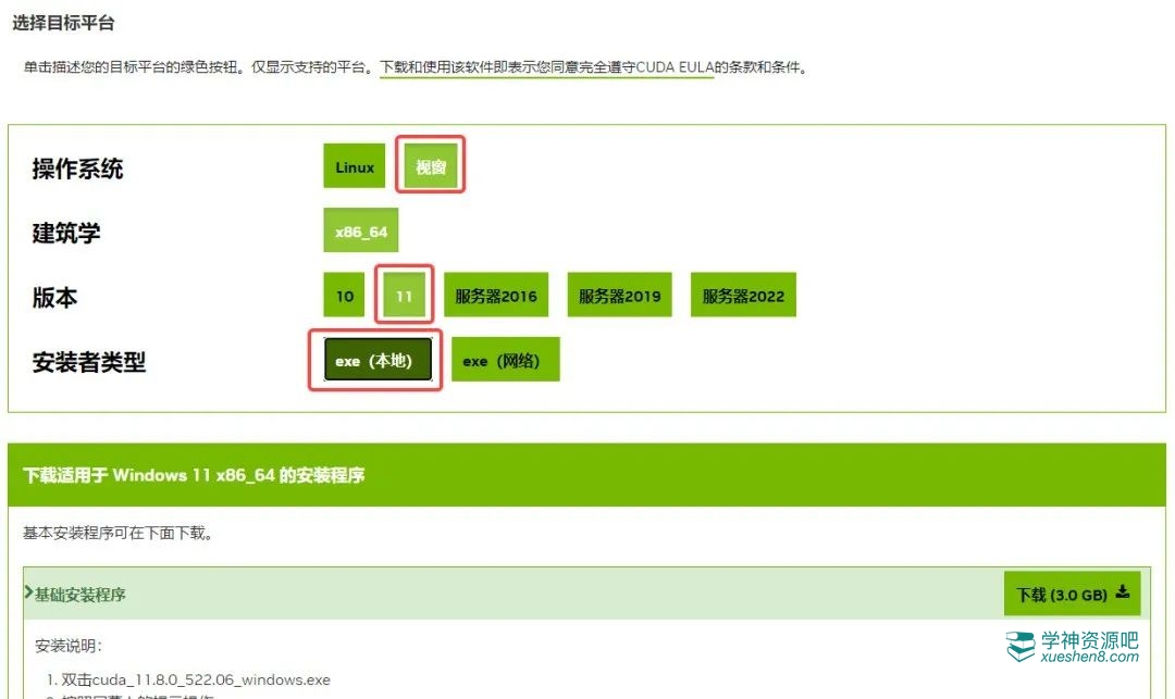 下载CUDA安装程序。由于文件比较大,约3GB左右,请确保你的网络连接稳定,并保持耐心等待下载完成。