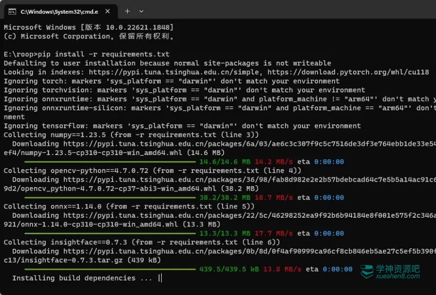 在该文件目录下的地址栏输入“cmd”,在弹出的命令提示窗口里,输入以下命令,用来安装Roop所需的文件: