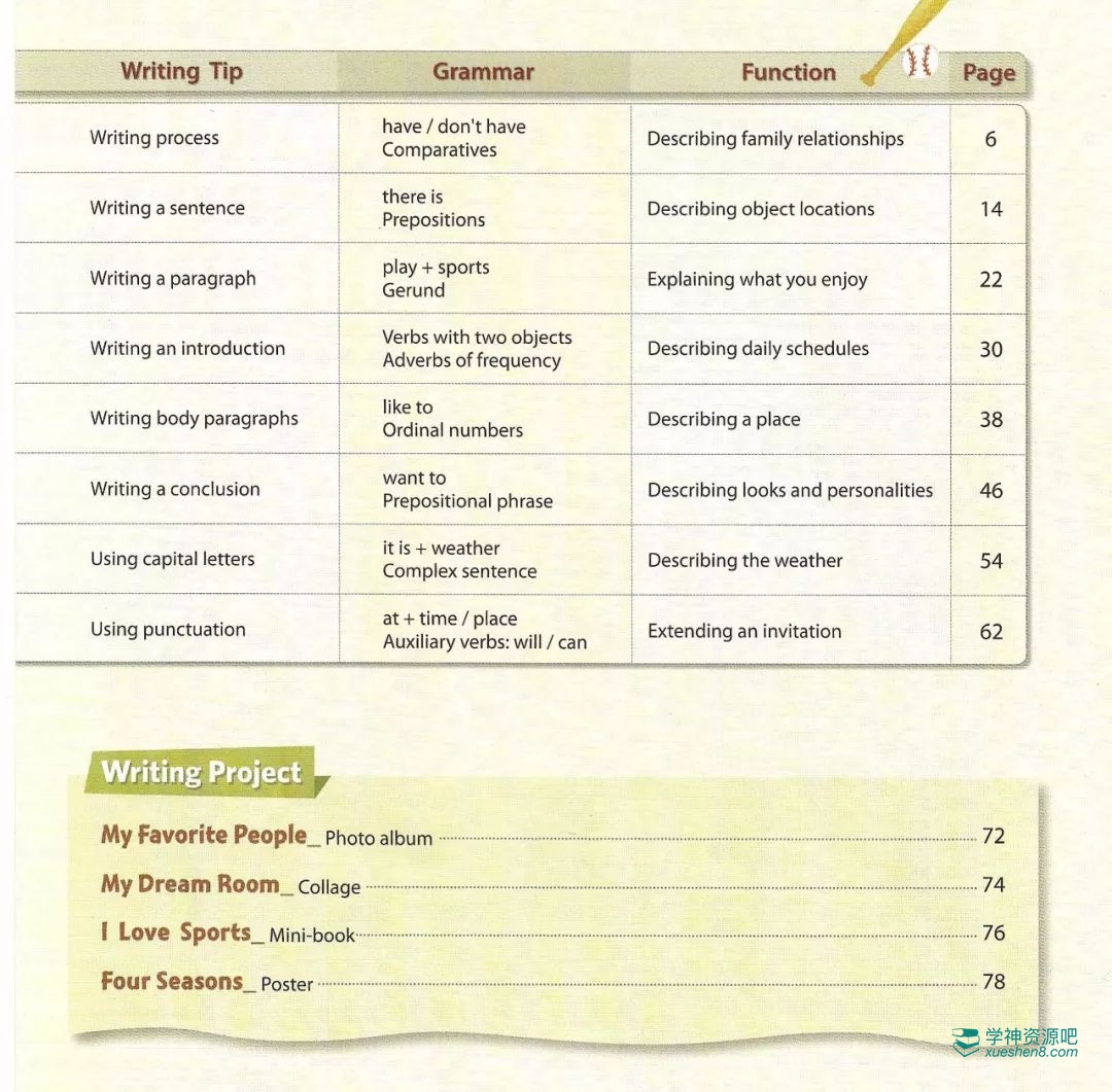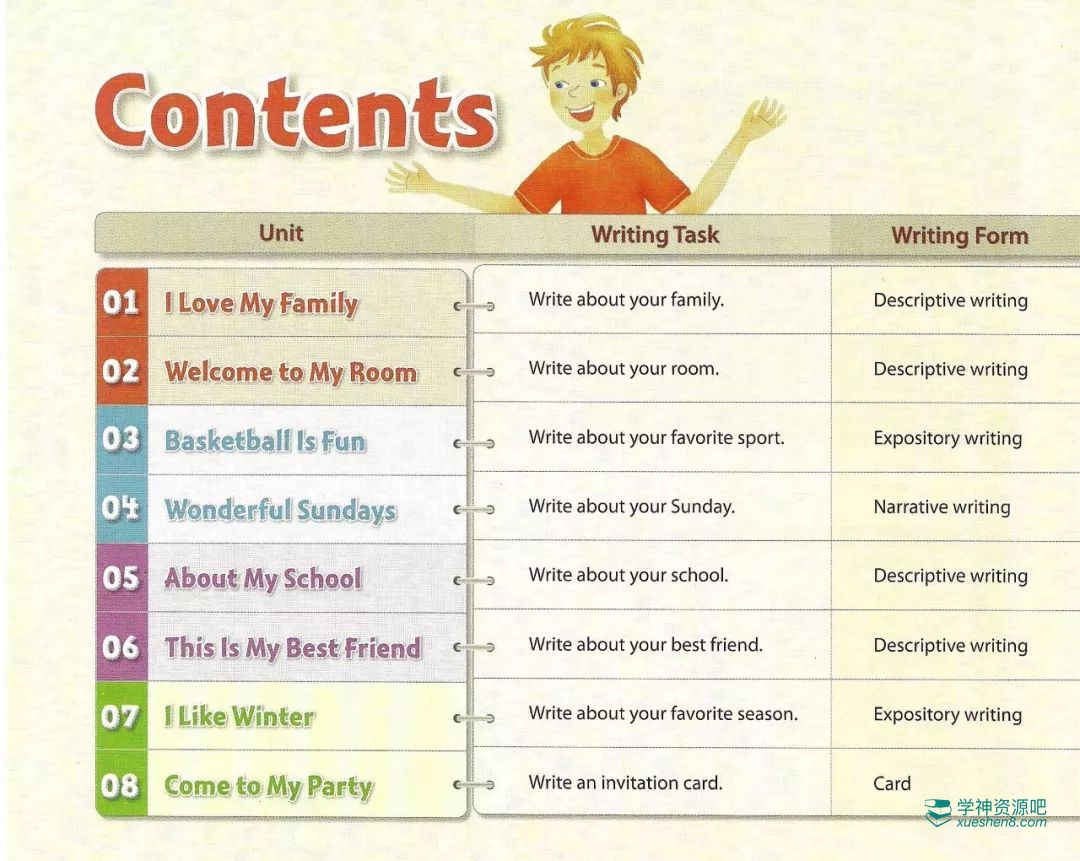 3个级别,每个级别都包括8个单元,主题贴近生活,每个单元都指出写作任务,以及本单元学习的写作体裁。